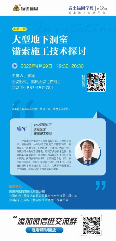 巖土錨固學(xué)苑將于2024年3月23日(周六)19:30-20:30舉辦第12期,本期主題:大型地下洞室錨索施工技術(shù)探討,歡迎廣大巖土錨固領(lǐng)域愛好者參與交流。