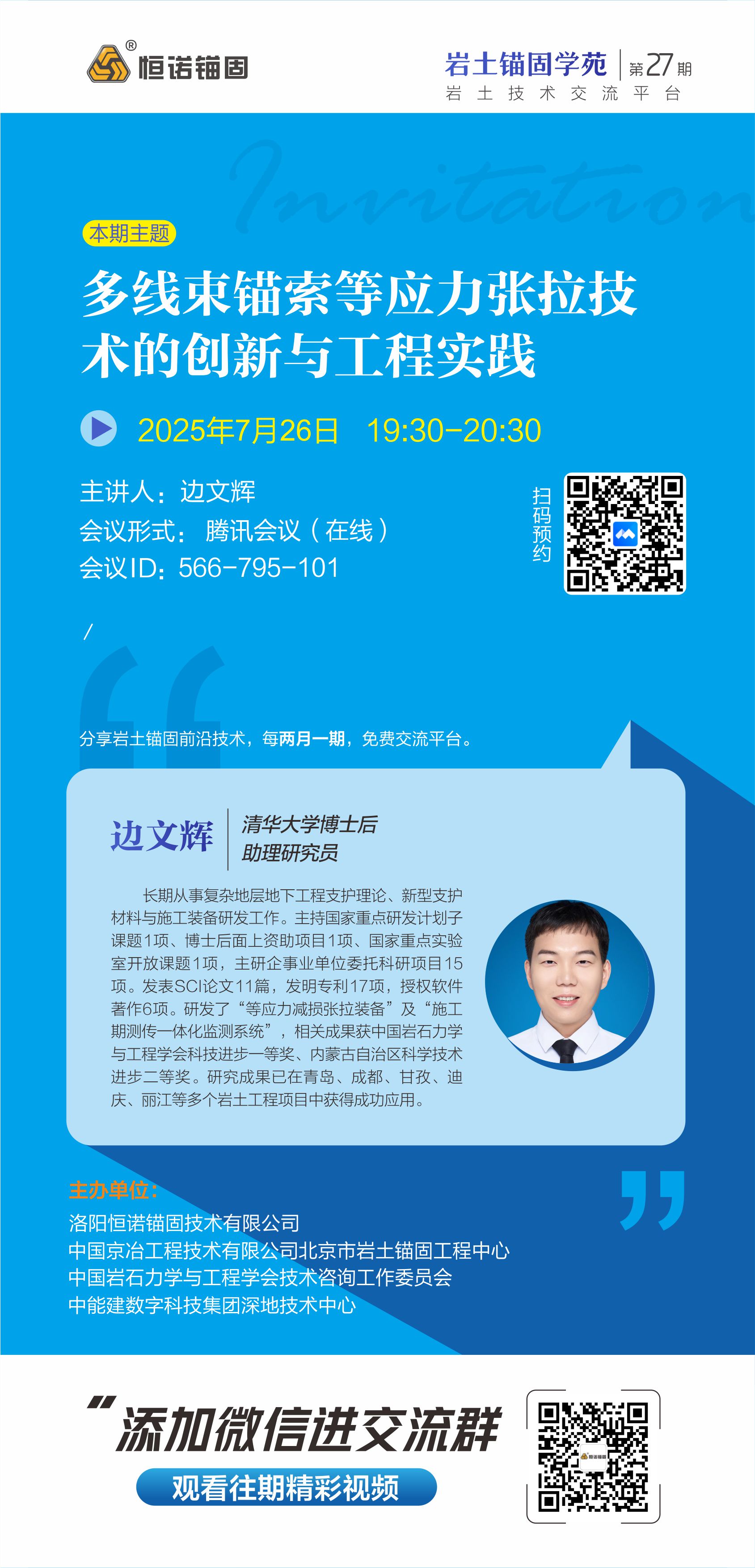 巖土錨固學苑將于2025年7月26日(周六)19:30-20:30舉辦第27期,本期主題:多線束錨索等應力張拉技術的創新與工程實踐,歡迎廣大巖土錨固領域愛好者參與交流。