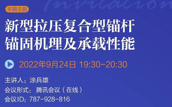 發布日期:2022-09-19 09:55巖土錨固學苑將于2022年8月27日(周六)19:30-20:30舉辦第期,本期主題:可回收錨桿技術研究綜述,歡迎廣大巖土錨固領域愛好者參與交流。 會議形式:騰訊會議(在線......