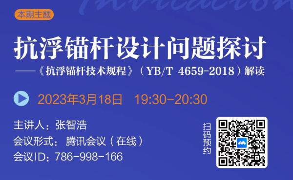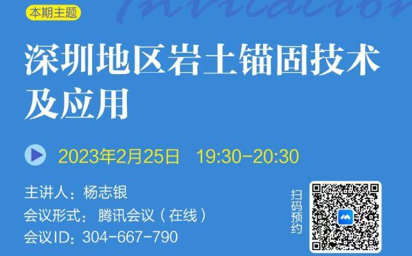發布日期:2023-01-07 17:10巖土錨固學苑將于2022年12月17日(周六)19:30-20:30舉辦第8期,本期主題:巖土工程柔性支護新技術及應用,歡迎廣大巖土錨固領域愛好者參與交流。...