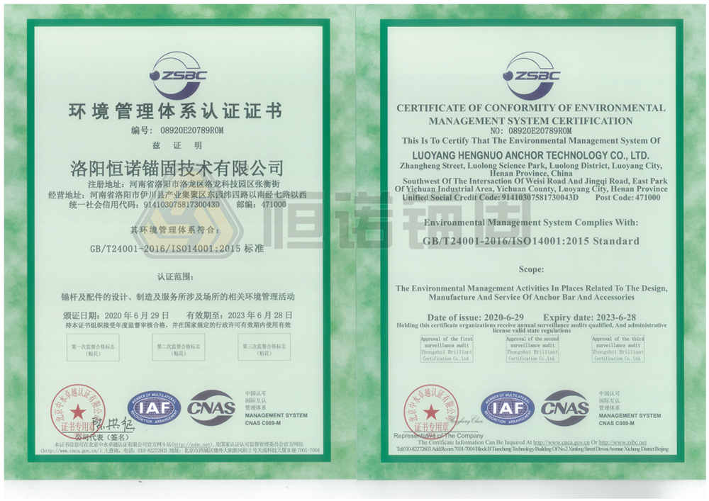 發布日期:2020-05-31 17:202020年6月29日,洛陽恒諾錨固技術有限公司順利通過ISO14001:2015“環境管理體系認證”及ISO45001:2018“職業健康安全管理體系認證”。ISO14001環境管理體系認證,是指依據I......