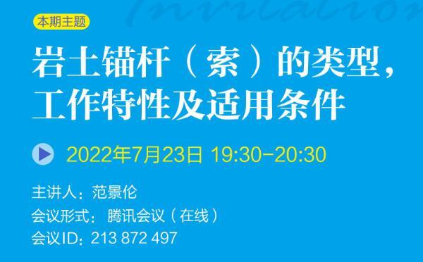 巖土錨固學苑將于2022年7月23日(周六)19:30-20:30舉辦第3期,本期主題:巖土錨桿(索)的類型,工作特性及適用條件,歡迎廣大巖土錨固領域愛好者參與交流。...
