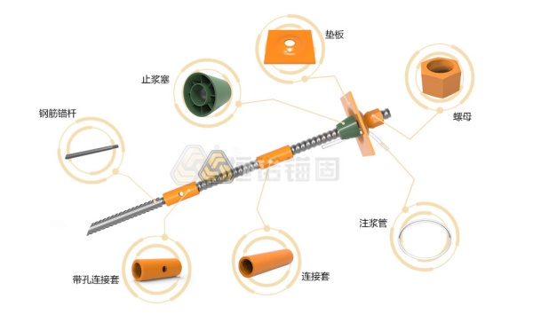 自鉆式錨桿是一種集鉆孔、注漿與錨固功能于一體的高效支護形式。其核心特點在于,施工時以中空桿體作為鉆桿直接鉆進,并可同步通過桿體內部通道灌注漿液。成孔后,中空桿體無需拔出,直接作為錨桿留在巖體中,最終形成全長粘結型錨固體。該施工工藝有效避免了復雜地質條件下的塌孔風險,具有施工快捷、適應性強等突出優點,尤其適用于破碎巖層和軟弱圍巖砂卵石地段支護工程。